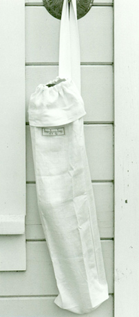 Dimensions: 11 inches long, 14 inches wide. Holds two one pound loaves or a challah bread. 100% bamboo fabric. Made in California from imported materials. Machine washable and dryable. $16. Here is how to fold your loaf pouch into a small packet. | Dimensions: 27 inches long, 8 inches wide. Holds up to three baguettes. 100% bamboo fabric. Made in California from imported materials. Machine washable and dryable. $16. Here is how to fold your baguette quiver into a small packet. |